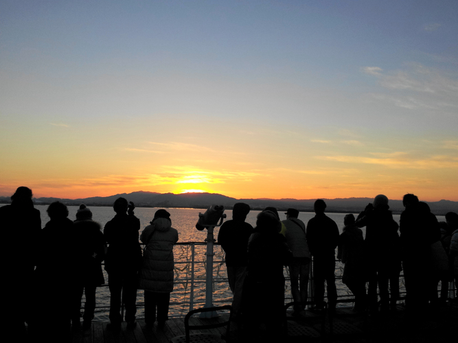 初日の出クルーズは、日本最大の湖・びわ湖で、新年のスタートを迎えていただく毎年恒例のクルーズです。「外輪船ミシガン」で約60分間のクルーズを楽しみながら、美しく厳かなご来光をご覧いただけます。山間から昇る日の出が湖面を赤く染めゆく様は、とても美しく湖上ならではの光景です。自然が織りなす感動のひとときと共に、新年のスタートをぜひ、びわ湖でお迎えください。