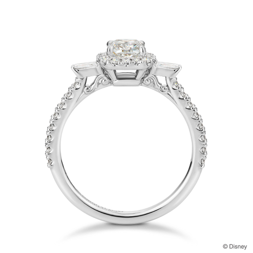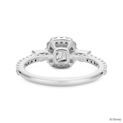 「シンデレラ」をイメージしたクッションカットダイヤモンドをセンターに。石座の隣にはテーパーカットのダイヤモンドを留めました。32ピースのメレダイヤモンドが、魔法のように華やかなきらめきを放ちます。側面には「お城」の装飾をモチーフにしたデザインを施しました。石座の裏側には、「シンデレラ」の夢を叶えるきっかけとなった「ガラスの靴」のモチーフを添えています。