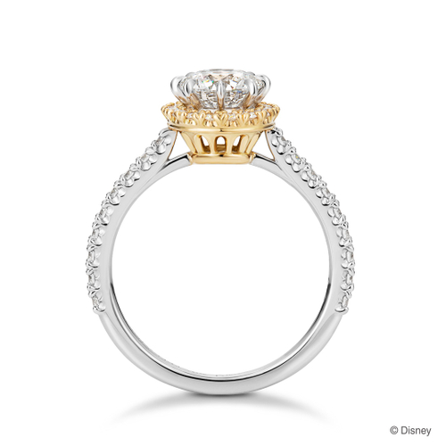 1.0ct台のシンプルながら華やかなラウンドカットダイヤモンドがセンターに輝くデザインです。大粒のダイヤモンドを支える石座は、「ベル」と「野獣」が心通じ合い踊るボールルームの装飾をイメージ。34ピースのメレダイヤモンドがきらめきを添えます。石座の裏側に、真実の愛へと導いた「魔法のバラ」のモチーフをデザインしています。