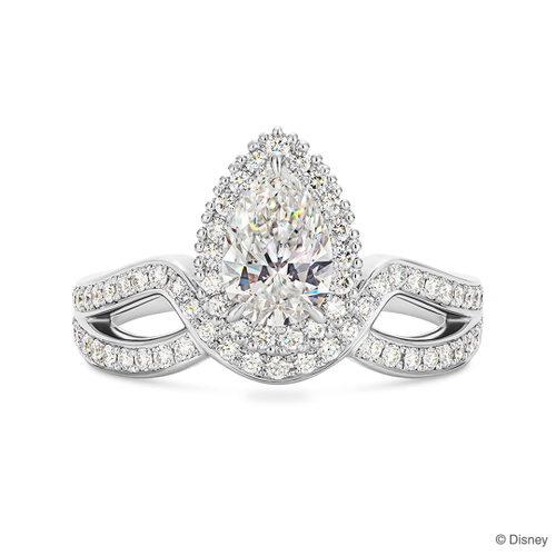 『塔の上のラプンツェル』に登場する「ラプンツェル」のティアラにインスパイアされたデザイン。ひときわきらめくペアシェイプカットダイヤモンドの周りにメレダイヤモンドをセッティングし、さらに華やかさを添えます。裏側には王国のシンボル「太陽の紋章」をデザインしました。