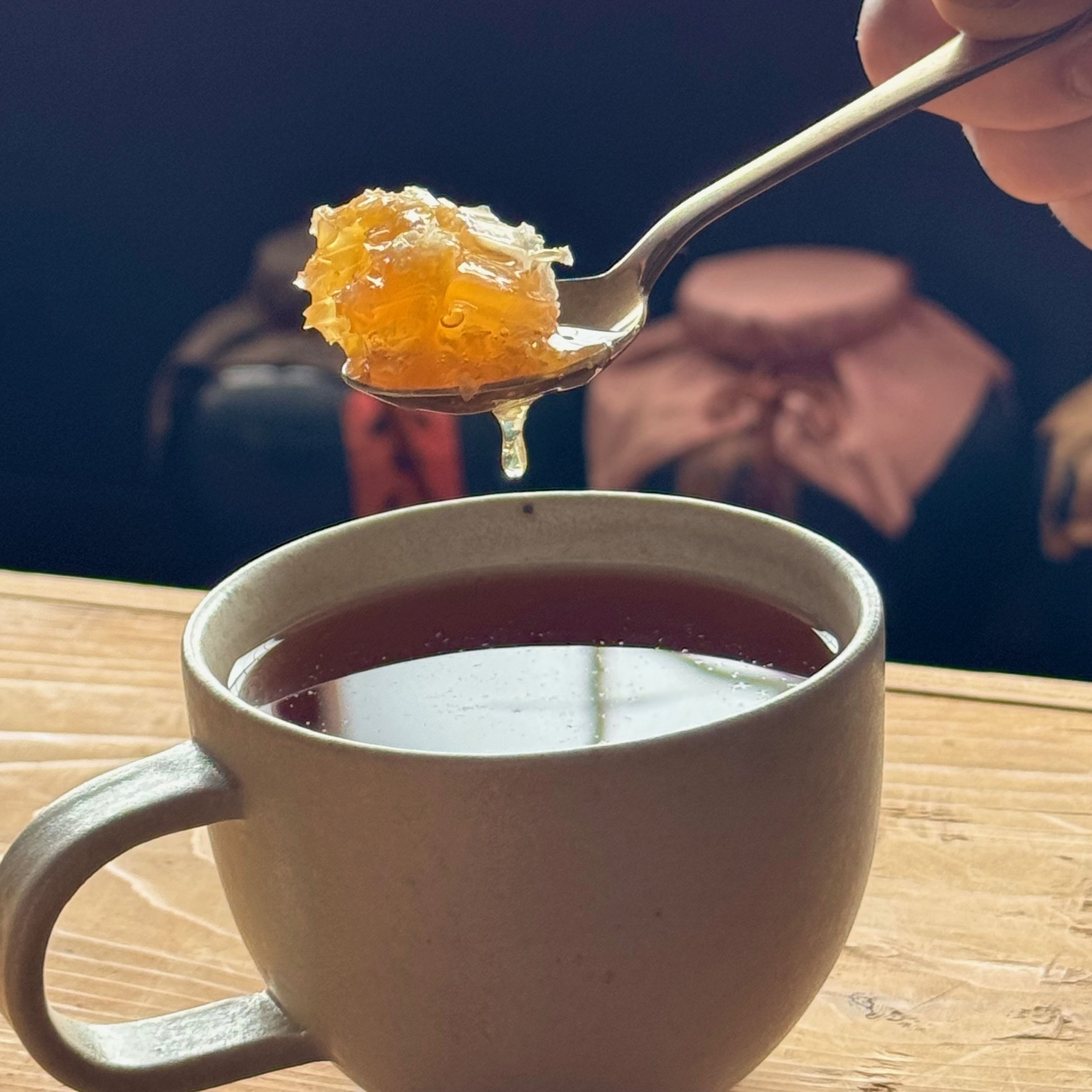 巣蜜をゆっくりと和紅茶に溶かし込むと、蜜のまろやかな甘さが少しずつ広がり、茶葉のやさしい渋みと溶け合って上品な余韻を生み出します。