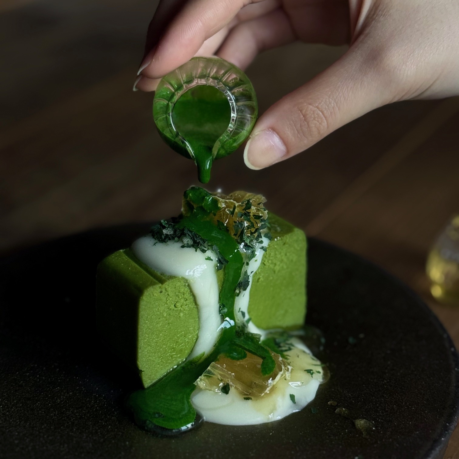 堀養蜂園の巣蜜(コムハニー)を贅沢に添えた「蜂蜜抹茶テリーヌ」は、自然の甘みと高級抹茶の深い旨みが溶け合う特別な一皿です。