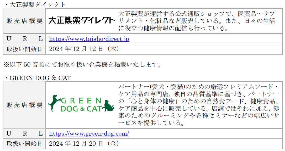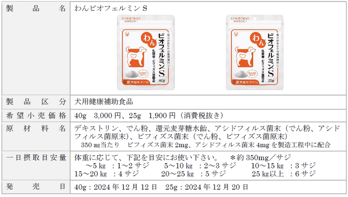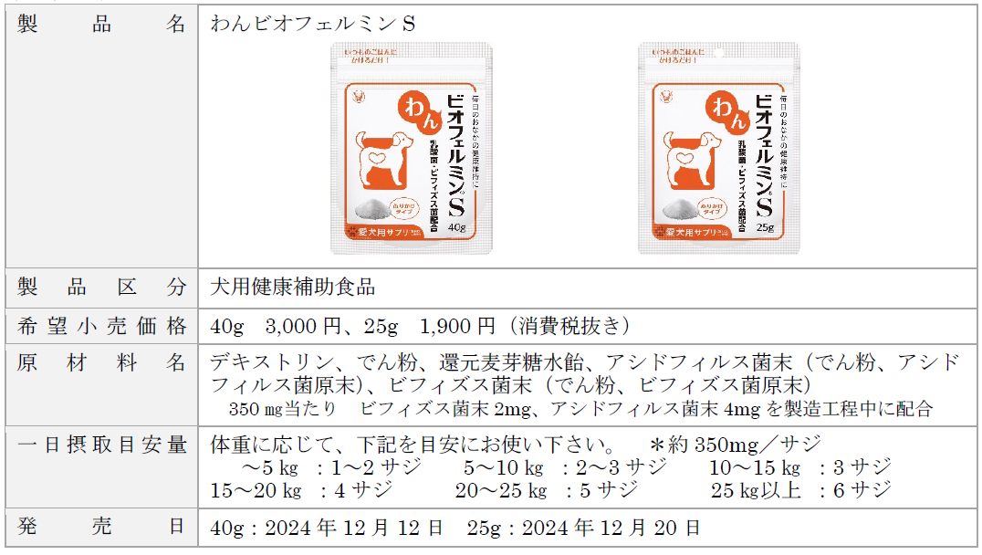 大正製薬株式会社[本社:東京都豊島区 社長:上原 茂](以下、当社)は、愛犬用・愛猫用サプリメント(犬用・猫用健康補助食品)となる「わんビオフェルミンS」「にゃんビオフェルミンS」を2024年12月12日(木)より順次発売※いたします。