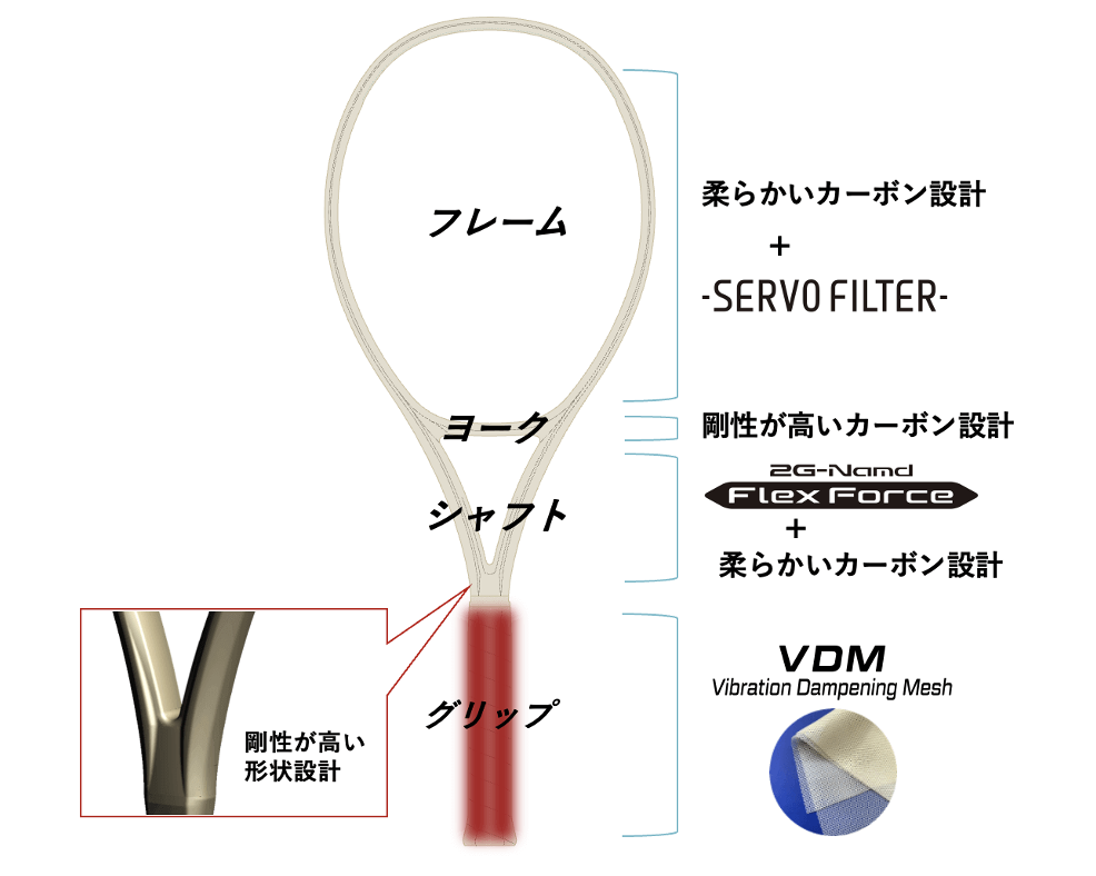 Servo Filterや2G-Namd™ Flex Force、VDMなどヨネックス独自のカーボン技術を組み合わせることで、パワー、安定性、ホールド性能を最適化。