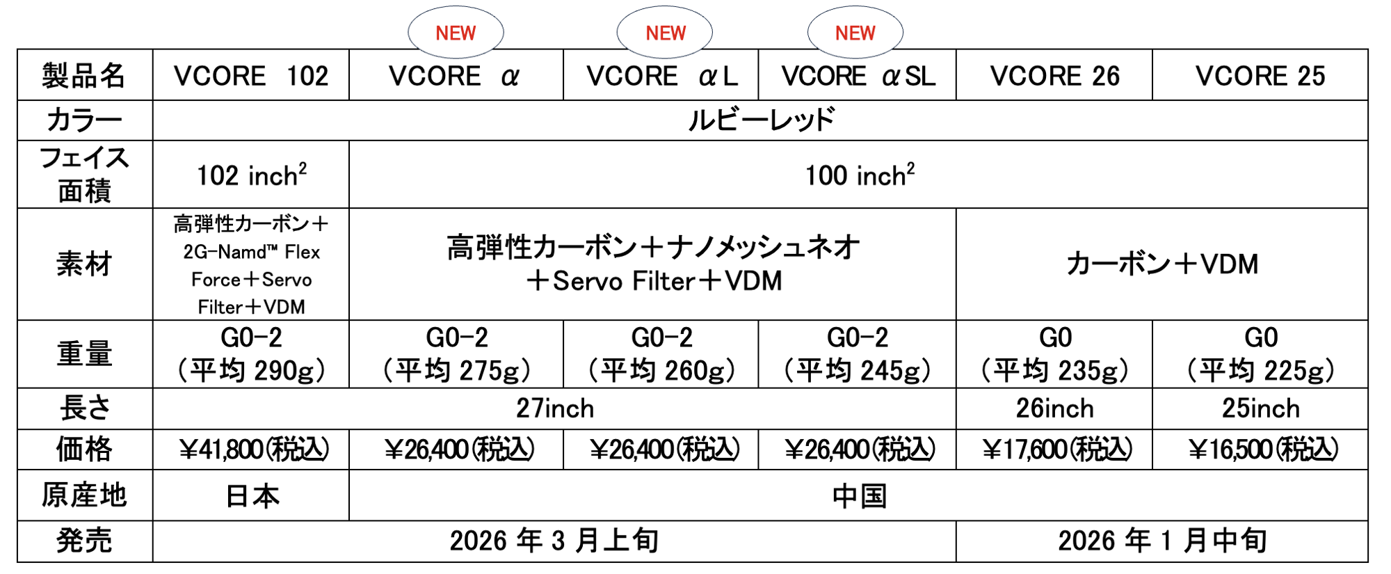 今回、VCOREの新カテゴリーとして「VCORE α(アルファ)シリーズ」を新たにラインナップ。上位モデルの最新テクノロジーを搭載し、高いスピン性能を備えながら、お手頃な価格となっており、ステップアップを目指す中上級ジュニアや初中級テニス愛好者におすすめのモデルです。