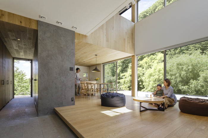 リビングの北東側は、大きなガラス戸にし、部屋のどこにいても四季折々に変化する景色を楽しむことができるように設計しました。1、2階は吹き抜けになっており、縦横に広がる窓と相まって、解放感は抜群です。さらに2階には子ども部屋と寝室があり、寝室の吹き抜けに面する壁を四角く、くり抜きました。その理由について、夫・Rは…。