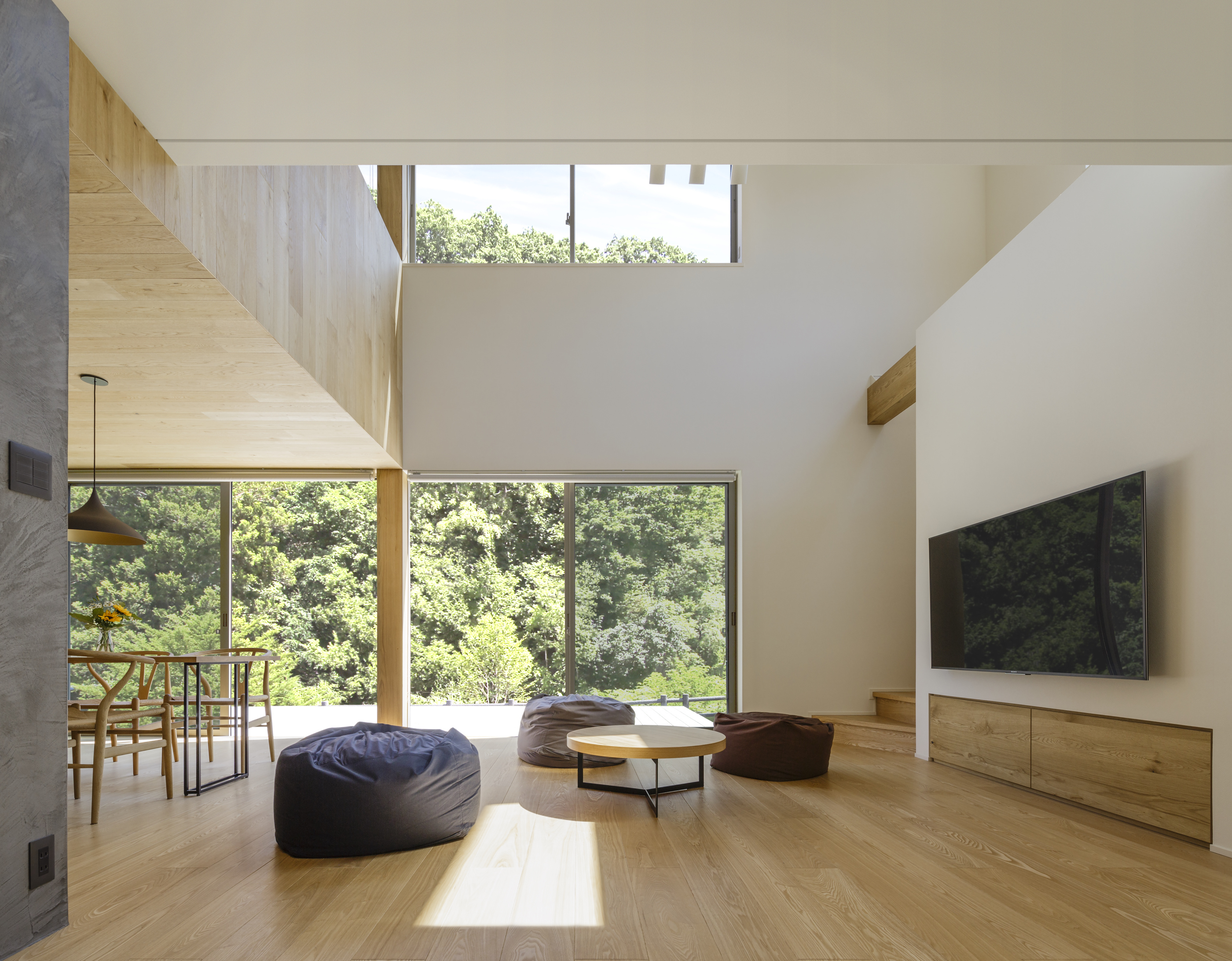 「寝室の壁をくり抜いたのは、寝室の窓と吹き抜けの窓からの景色を連続させるためです。」