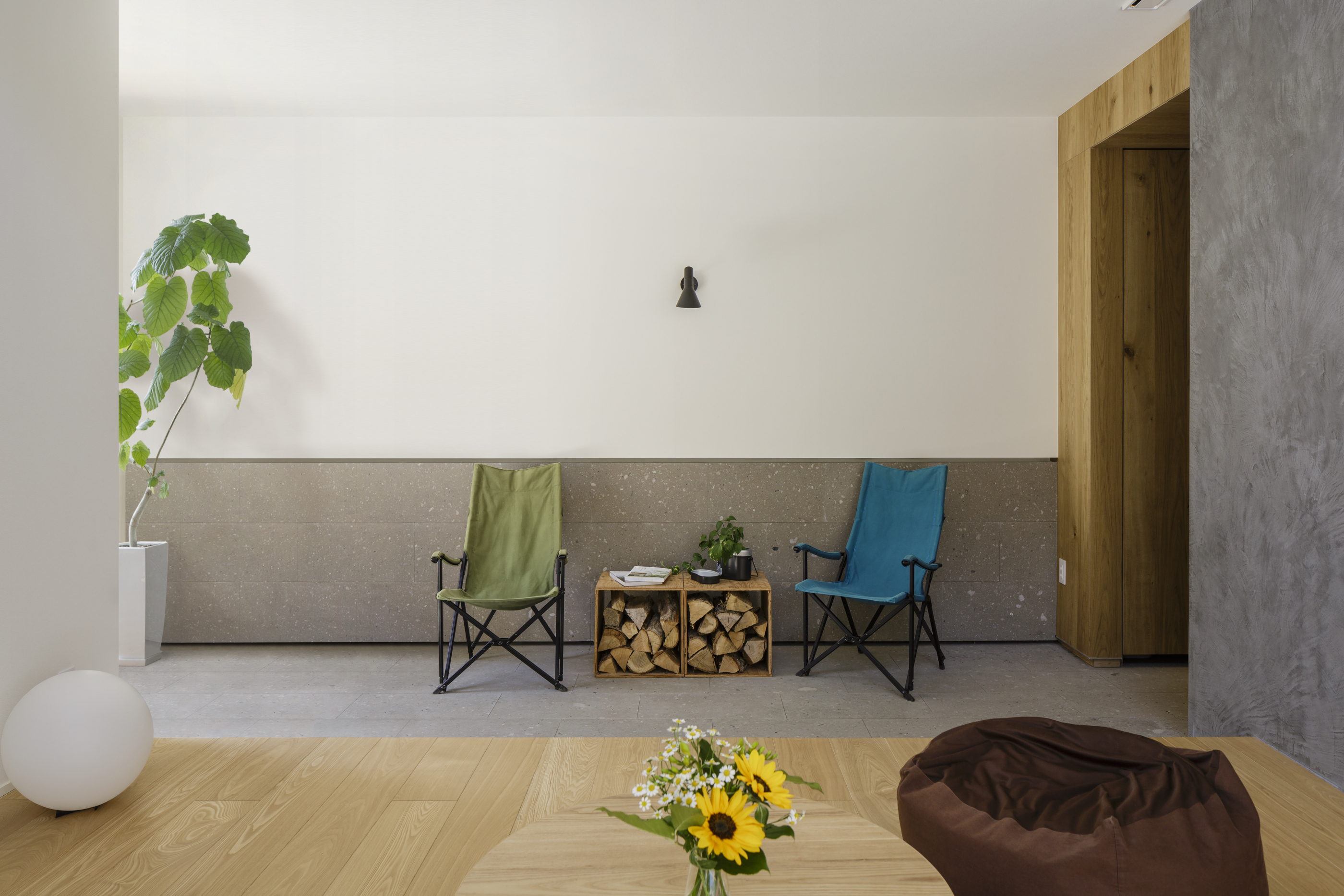 玄関から土間に続く細長い玄関ホールは「おうちキャンプ」の重要な動線です。天井の高さまである玄関収納には、キャンプ用品などが納められ、土間にはアウトドアで使う折りたたみ式のチェアやテーブルが置いてあります。壁付照明が土間に灯ると夜のキャンプサイトのような落ち着きを醸し出します。ちょうどおしゃれなキャンプ風カフェのような趣です。これならいつでも「おうちキャンプ」をすることができますね。