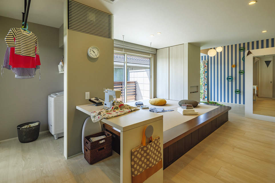 中央付近には畳コーナーを設け、もうひとつの家族の「いどころ」に。作業台と対面しているため、家事をしながら子どもを見守ることができます。お昼寝や寝る前の家族団らんなど、多目的に使える空間です。