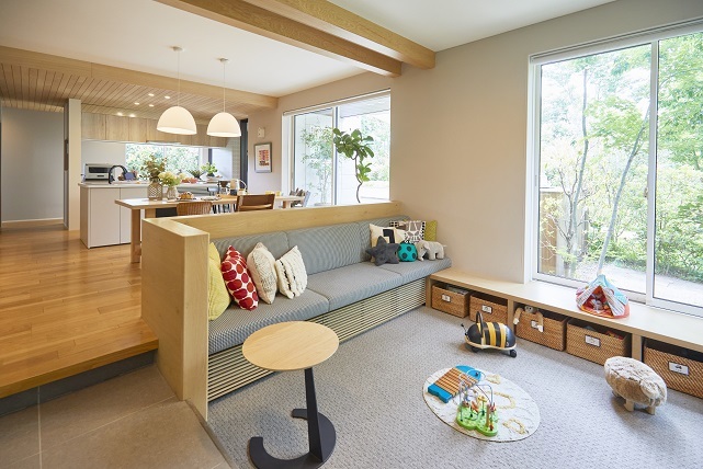 子どもの主な「いどころ」は、床を一段下げた「こもり感」のあるピットリビングです。子どもが安心して遊べるだけでなく、大きな窓から光が差し込み、大人もつい長居したくなる心地よい空間です。窓際のベンチの下には子ども専用の収納も。遊んだおもちゃをすぐに片づけられ、お片付けの習慣づけにつながります。