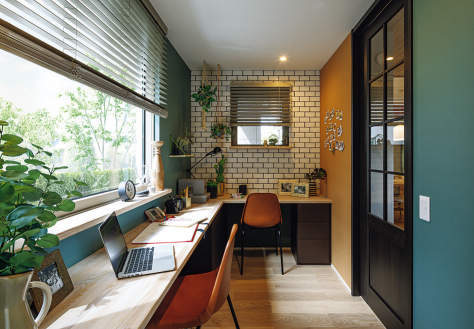 キッチン横には、集中して仕事ができるワークステーションも設置。プライベート感はありつつも、リビングに近いため、家族の気配を感じることができます。背面の扉はガラス張りにし、リビングで過ごす子どもから親の姿が見え、安心感があります。