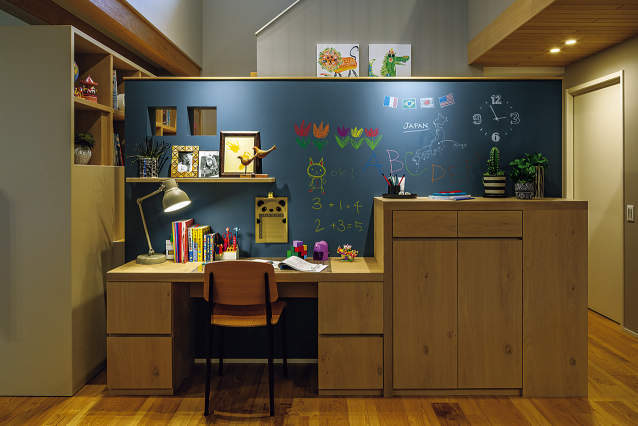 ダイニングテーブルの横は、デスクや収納がつくり付けられたファミリーステーションです。子どもがすぐ家族に質問できるリビング学習は、人気のスタイルです。壁側を向くことで適度に集中しながら、家族と同じ空間で過ごす安心感もあります。十分な収納も確保し、勉強道具だけでなく大人の作業に必要なものまでスッキリ整頓できます。