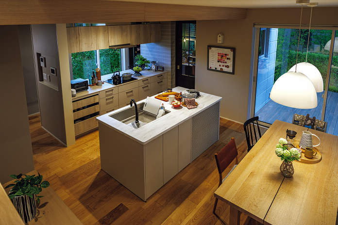 大きなダイニングテーブルの奥はキッチンです。コンロとシンクが別々のセパレートキッチンで、家族みんなが家事に参加しやすく、食事の準備を通じてコミュニケーションが広がります。ピットリビングで過ごす家族や、ファミリーステーションで勉強をする子どもの様子を見守りながら家事ができるのも魅力です。