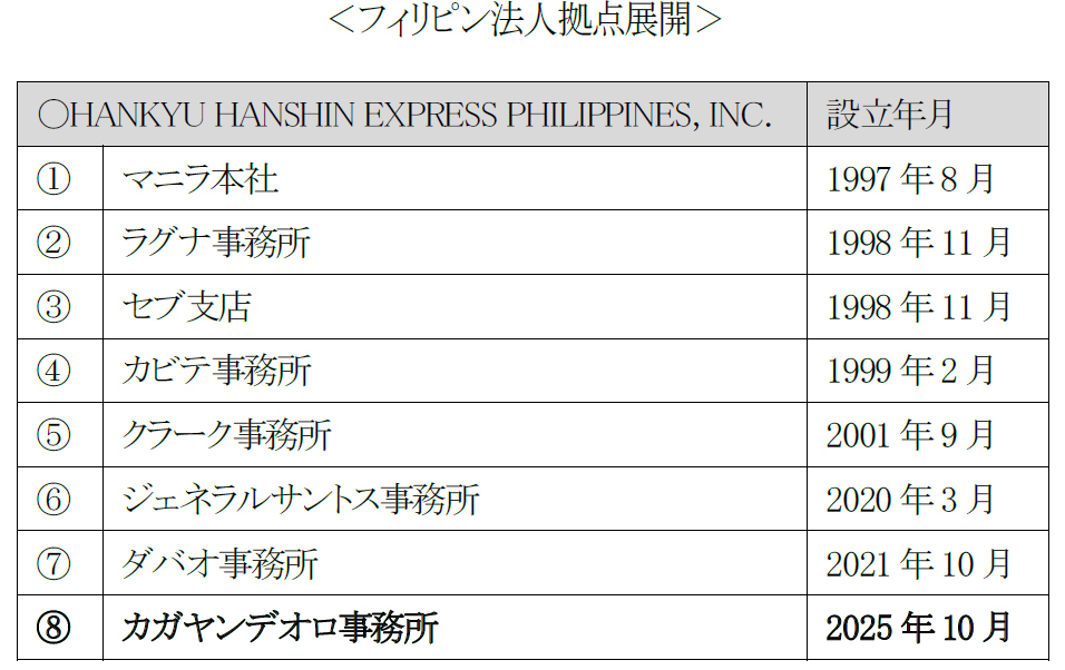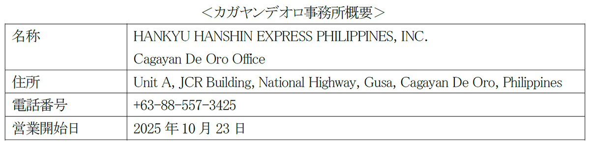 阪急阪神エクスプレス(本社:大阪市北区 代表取締役社長:谷村 和宏)のフィリピン法人である HANKYU HANSHIN EXPRESS PHILIPPINES, INC.(本社:マニラ)は、フィリピン・ミンダナオ島北部の中心都市であるカガヤンデオロ市に新たに事務所を開設し、10月23日より業務を開始します。