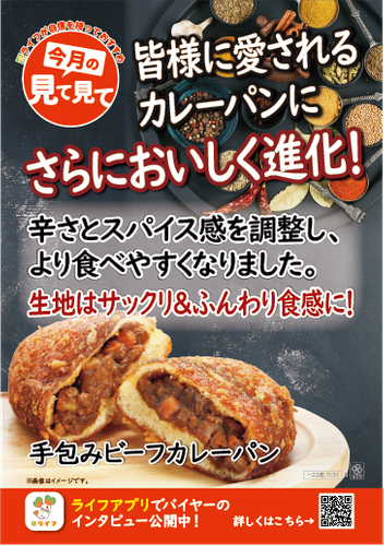 ライフが自信を持っておすすめする「今月の見て見て」の7月商品に選ばれた「手包みビーフカレーパン」は、「カレーがおいしい!」「具材のゴロゴロ感が良い!」とご好評をいただいており、年間130万個以上を販売する大人気商品です。2年ぶりとなる今回のリニューアルでは、ライフオリジナル配合の24種のスパイスが香り、カレーの辛さを抑えまろやかさとコクをお楽しみいただける味わいに仕上げました。カレー好きの方にはもちろん、カレーは甘口・中辛派という方にもおすすめです。