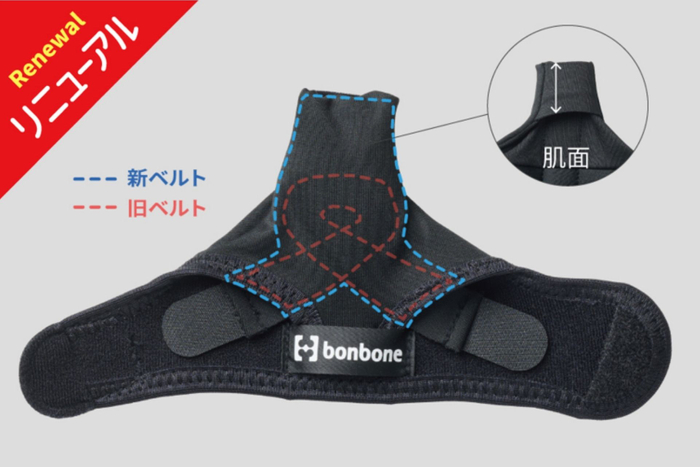 独立していたクロスベルトを本体の生地と一体化したことにより、親指にかかる圧力を分散します。また、親指内側の生地の幅を広げたことで親指に食い込みにくく、より快適な着け心地になりました。