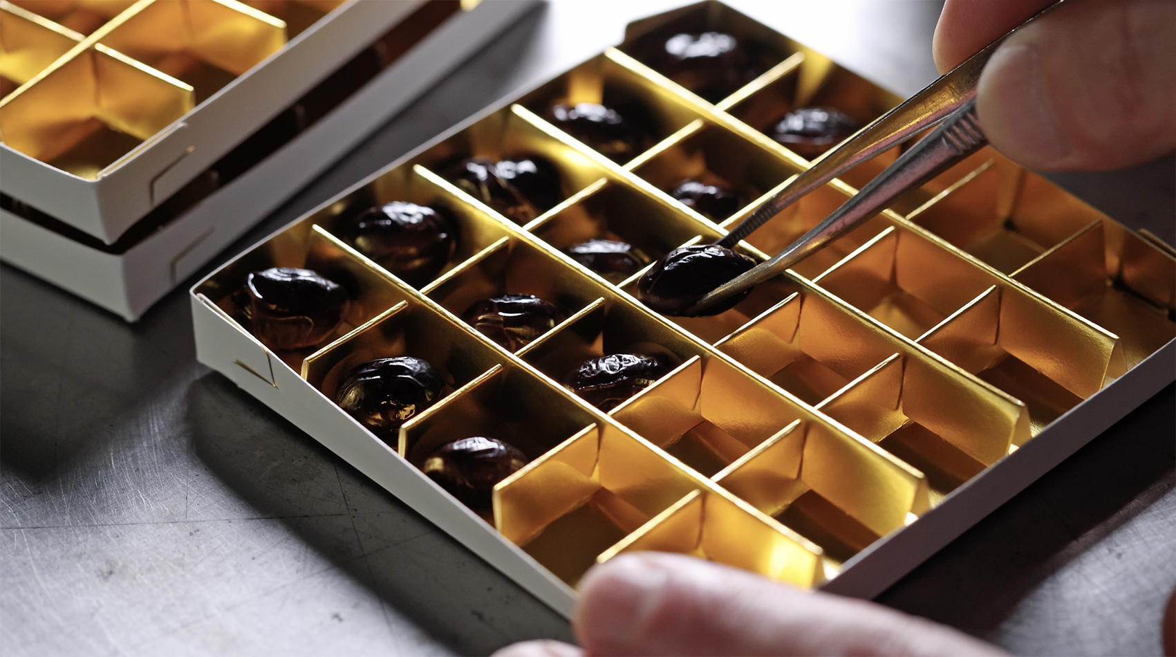 5列×5段の仕切り容器に、職人が一粒ずつ25粒を手作業で並べて仕込み。