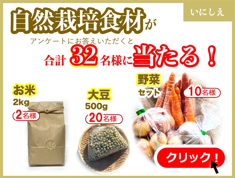簡単なアンケートに答えていただいた方から抽選で32名様にお米・野菜・大豆などの自然栽培食材をプレゼントいたします。