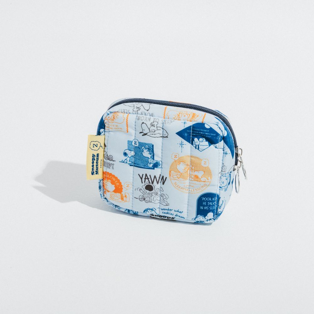 ライナスとスヌーピーの総柄がかわいいキルティングポーチ。マチ付きで化粧品や小物を入れて持ち運ぶのにぴったりなサイズです。