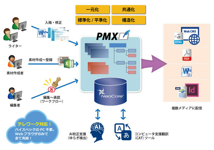 マニュアル作成支援システム「PMX」は、基本機能に加え、コンピュータ支援翻訳(CAT)ツールや、サイバーテックが提供する、AIによる校正支援(ゆらぎ検出)APIとの連携をはじめ、様々な外部ツールとの連携が可能となります。国内シェアNo.1のXMLデータベース「NeoCore」を内蔵することで、コンテンツの一元化と高速検索を可能としました。
