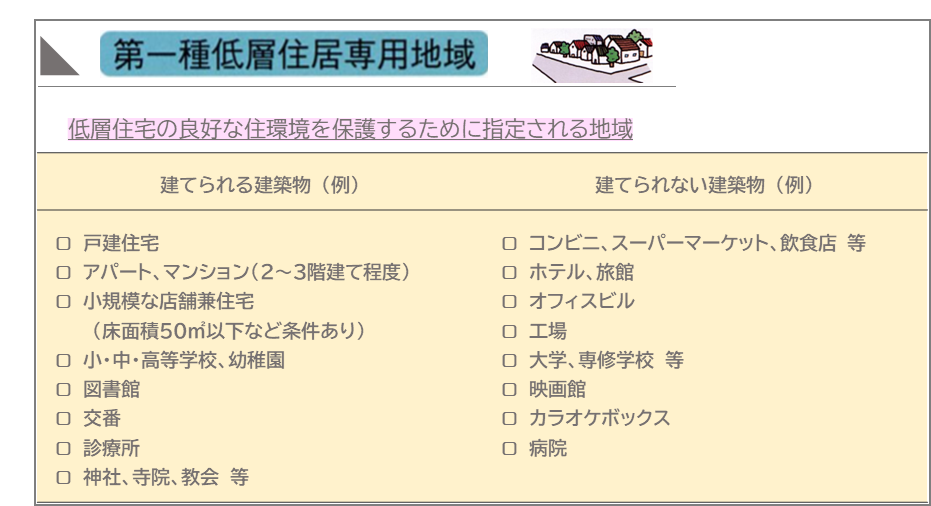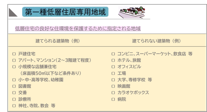 例えば、13ある用途地域の中の『第一種低層住居専用地域』を見てみましょう。