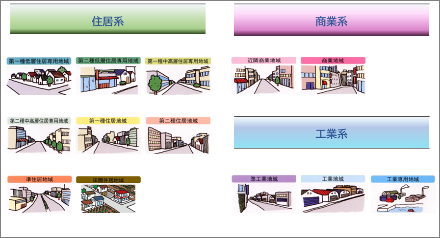 このルールこそが「用途地域」であり、都市計画法に基づいてエリア分け(ゾーニング)されています。