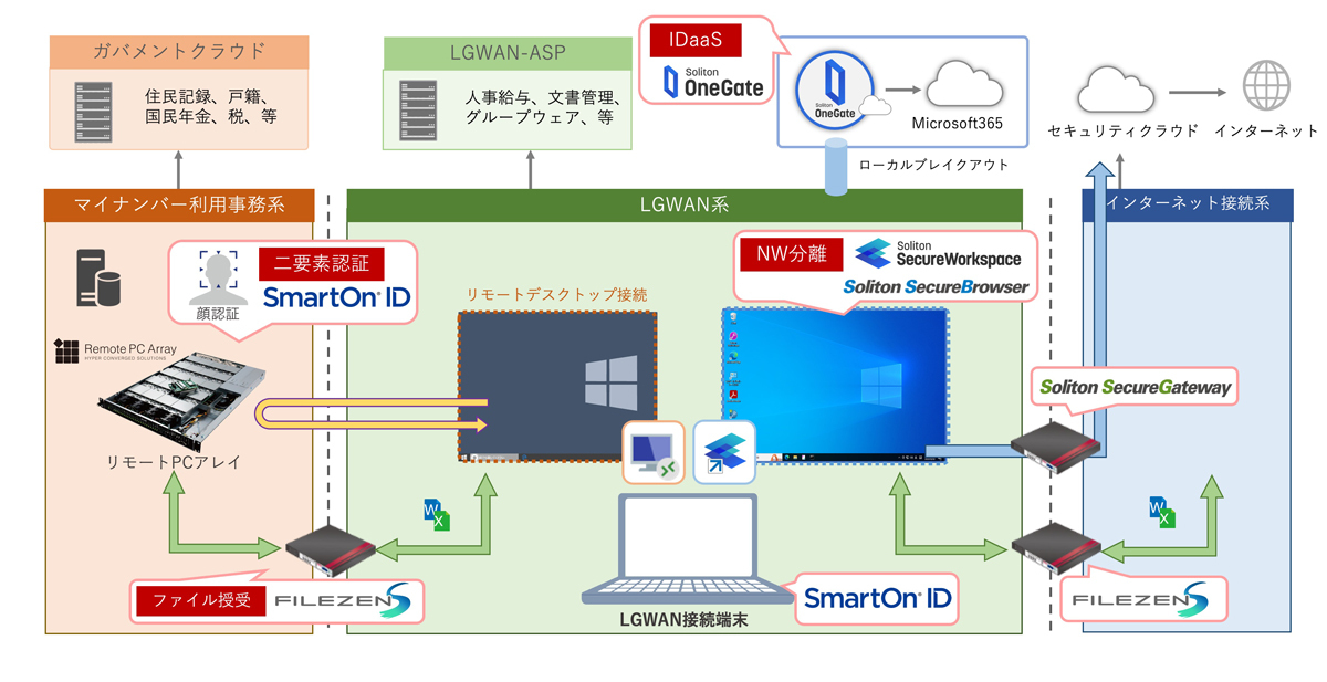 当展示会においては、当社製品「リモートPCアレイ」と、株式会社ソリトンシステムズ「SmartOn ID」等と連携し、三層分離環境における個人番号系へのセキュアリモートアクセスのデモンストレーションを行いました。この仕組みは宮崎県内の複数自治体へ導入しております。