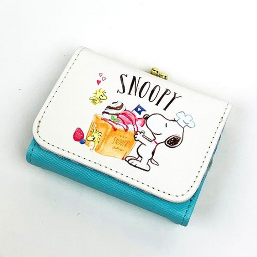 まずは三つ折り財布のご紹介です。コック帽をかぶったスヌーピーと、美味しそうなフルーツたっぷりのベーカリーがデザインされています。見た目にもキュートで美味しそう♪サイズは9.5×8×3cmで、コンパクトです。