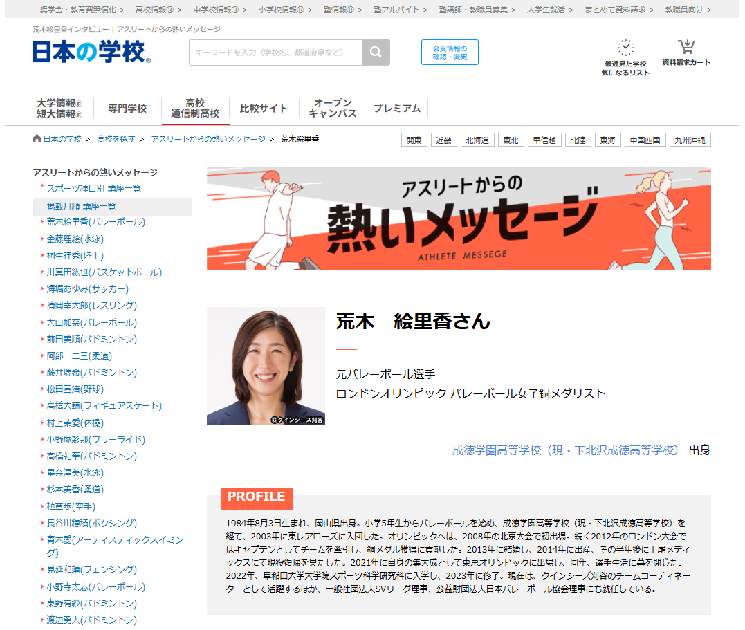 全国の大学・短大・専門学校などの学校情報を提供する、株式会社JSコーポレーション「⽇本の学校」では、注目のプロアスリートの学⽣時代の取り組みや、練習⽅法・⼼構えに関するアドバイスの他、⾼校⽣に向けた熱い応援メッセージを掲載しています。