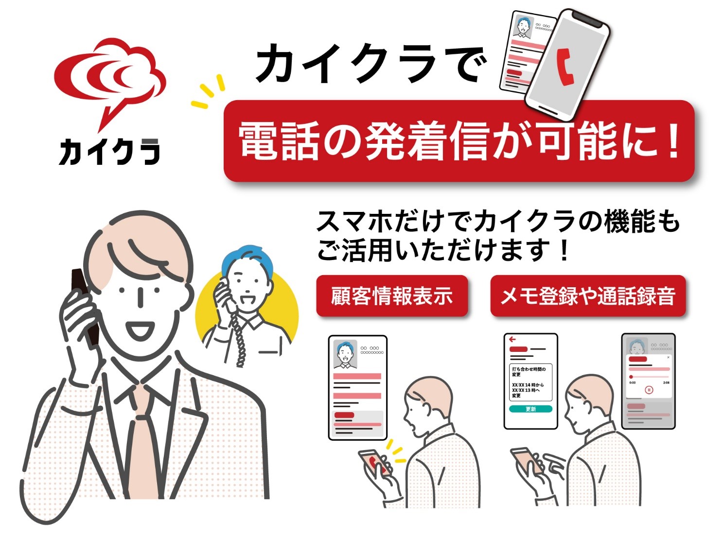 『カイクラフォン』は、固定電話がなくともスマホアプリ上から外線/内線の発着信や着信時の顧客情報表示、メモ管理、通話録音を行うことができます。また、CTIアダプタを設置する必要がないため、工事も不要ですぐに利用することが可能です。