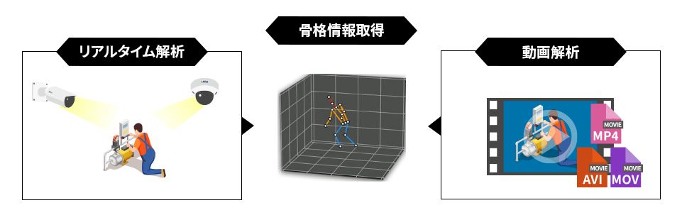 カメラからのリアルタイム映像や、録画された映像をAIが自動解析します。リアルタイムで解析結果が表示されるので、負荷の高い作業を即座に判断することができます。また録画された映像からの解析も可能です。