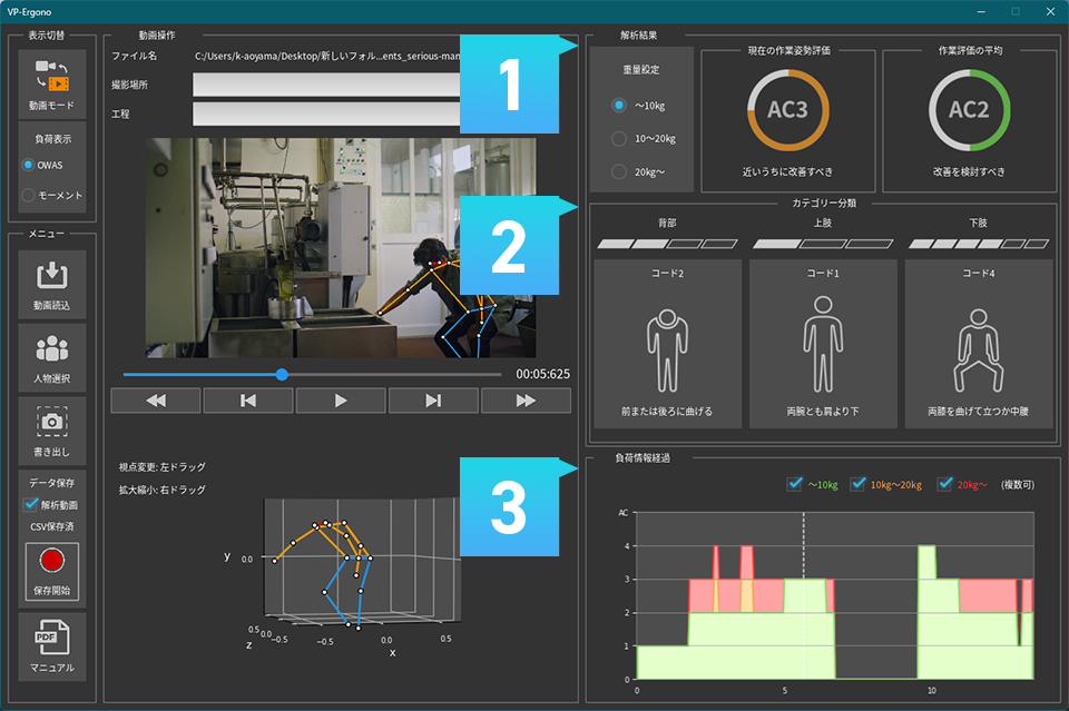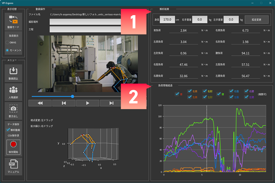 負荷の数値が重要なシーンにもVP-Ergonoは活用できます。骨格解析した情報を元に、身体の10カ所の負荷値を算出します。負荷のかかり具合の推移はグラフで確認できるので、解析したい動きを時系列で見える化することができます。