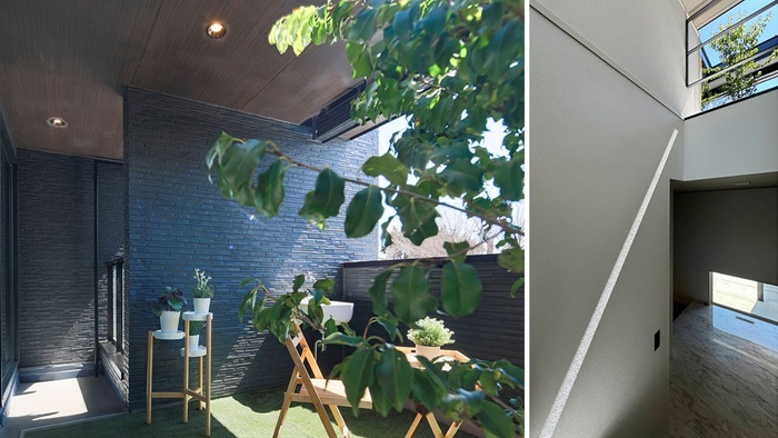 緑豊かな公園に面した2階建ての住居計画です。黒い3枚のプレートで分節された外観に白いボリュームを配し、2階中央のテラスを囲むようにLDKを配置しました。テラスにはシンボルツリーが植えられ、柔らかな木漏れ日が室内に降り注ぐように設計されています。