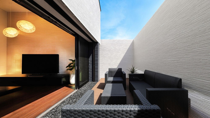幅3.6mという狭小な敷地に建つ、親子3人のための住宅です。厳しい法規制や高さ制限をクリアしながら、最大限の空間を確保しました。隣家が近接していることを考慮し、境界壁で囲まれた中庭を設け、ウッドデッキや緑化壁を配することで、豊かなプライベート空間を実現しています。