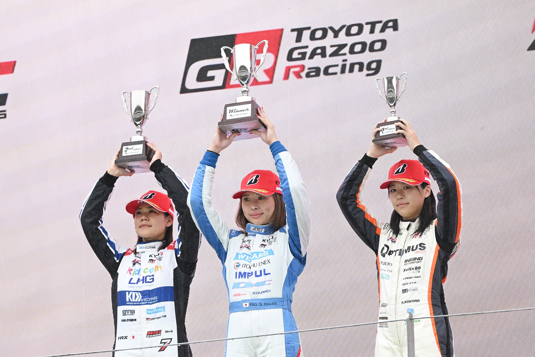 チャンピオン候補が下野、翁長の2名に絞られるなかで迎えた12周のKYOJO Finalは、12日(日)の12時55分からローリングスタートで開始された。トップの下野が加速で後続を引き離してレースをリードしようとするが、2番手の翁長もペースを上げて下野を猛追。ブレーキングで間合いを詰める翁長は下野との差を約0.6秒まで削るが、6周目のTGRコーナーでブレーキミスを喫し、再び差は拡大することに。ペースが落ちた翁長をかわした#1 斎藤愛未(BigBoss W TOM’S KYOJO with AIWIN KC-MG01)が2番手に浮上し、翁長は4番手を走行する#39 富下李央菜(OPTIMUS CERUMO・INGING KC-MG01)にも間合いを詰められていく。2台による3番手争いはファイナルラップに動きを見せ、翁長の背後についた富下がTGRコーナーで3番手に浮上した。トップを快走する下野は最後までペースを保ってチェッカーを受け、今季6勝目を飾るとともにフォーミュラ導入初年度のKYOJO CUPシリーズチャンピオンに輝いた。