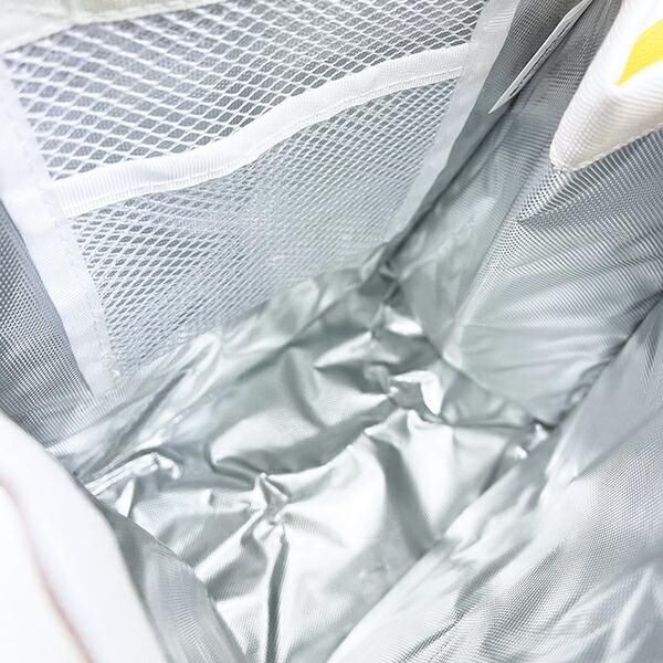 内側がアルミ張りになっているランチバッグです保冷機能付きばっちりです。ですので、お弁当や飲み物を保冷してくれて食品でも安心です。大き目なのでお買い物の冷凍ものを入れるときにも重宝するかもしれません。サイズ:20.5cm×13cm×24cm 素材:ポリエステル、アルミニウム