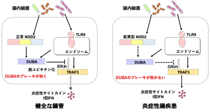 本研究ではNOD2がTLR9によるI型IFNの産生に及ぼす効果を解明し、その過程で炎症性腸疾患の新たな治療標的としてDUBAを同定しました。