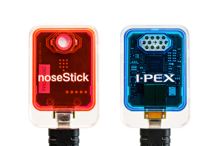 「noseStick」は、スマートフォンに挿すだけで特定の匂いを計測できるデバイスです。「匂いの見える化」を実現する「noseStick」には、I-PEXが開発した複数の検知素子が検出する「匂い分子のパターン」を認識し識別する匂いセンサを組み込んでいます。