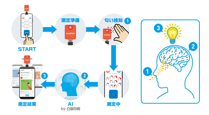 手のひらを「noseStick」にかざすことで、「高揚している」「落ち込んでいる」「気が張っている」「気が緩んでいる」の4つの気分の割合を分析。人間の手のひらが発する物質はその時々の状態や感情によって変化することから、「noseStick」での検知とAIによる分析を組み合わせることで、手をかざした人の「御機嫌」として表示します。