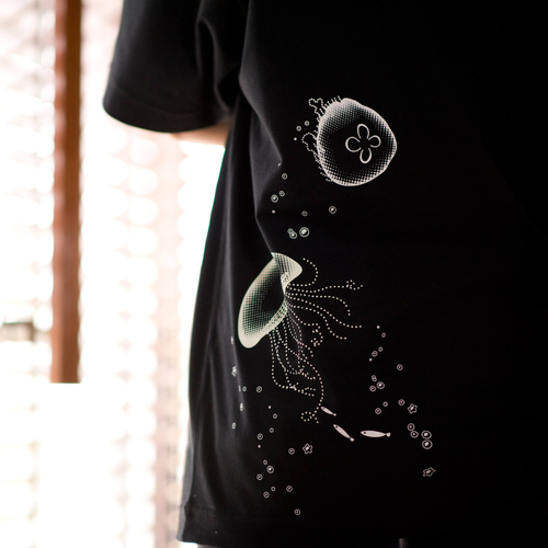 暗闇で光る蓄光プリントを使用し、クラゲのやわらかで幻想的な光を再現しました☆