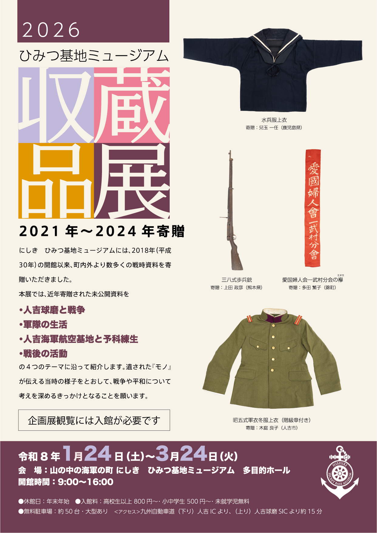 にしき ひみつ基地ミュージアム(錦町立人吉海軍航空基地資料館、熊本県球磨郡錦町)は、2026年1月24日(土)から3月24日(火)まで、2021年から2024年にかけて寄贈された未公開の戦時資料を紹介する収蔵品展「―モノが語る戦争―」を開催します。本展では、人吉球磨地域と戦争の関わりや当時の軍隊生活などをテーマに、約80点の資料を通して戦争の実相を伝えます。
