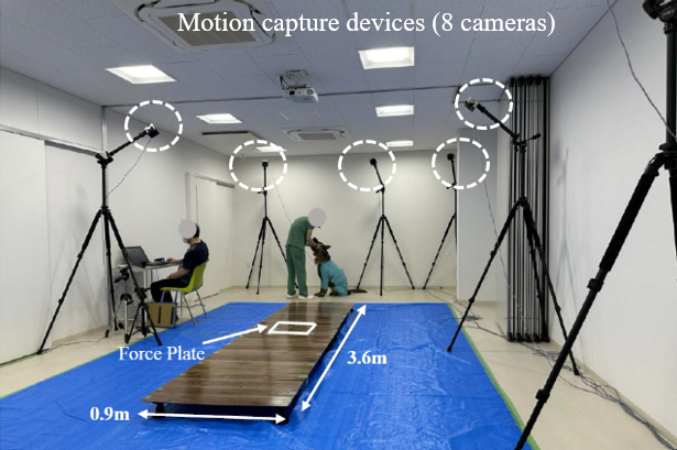 本研究ではリンレイ社の『滑り止め床用コーティング剤』塗布前後のフローリング床の滑りやすさ(摩擦係数)が、小型犬の歩行時における筋骨格*1系に与える影響を定量的に評価するため、フォースプレート、モーションキャプチャ、筋骨格*1シミュレーションおよびスティックピクチャーを用いて後肢の筋発揮量*3の変化を確認し、評価しました。