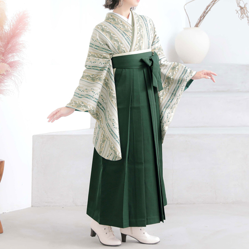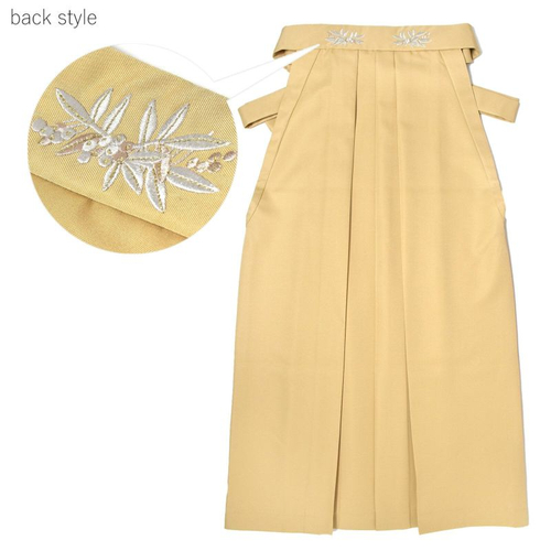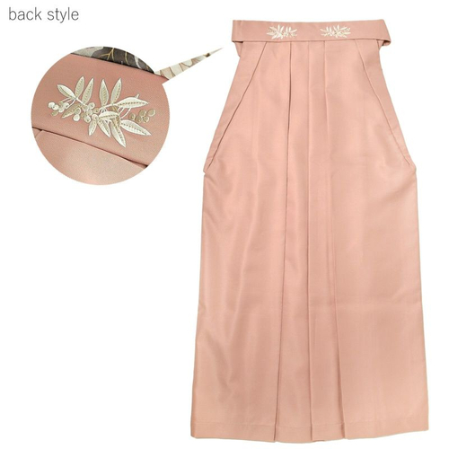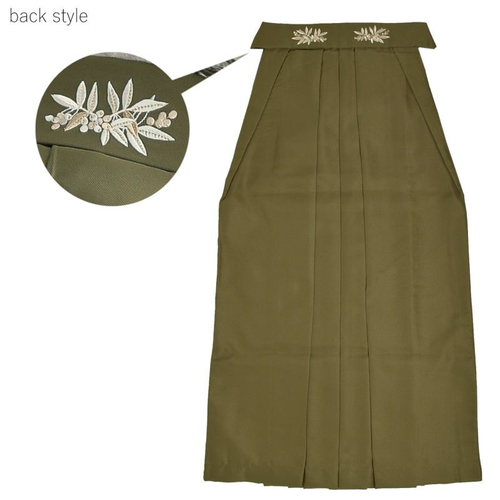 振袖や二尺袖着物に合わせやすいシンプルな単色に、後の腰の部分にワンポイントの南天の刺繍が入っています。中仕切りのない行灯袴(あんどんはかま)ですので、洋服のスカートと同じように穿くだけ。裾丈の長い着物でも合わせやすくなっています。