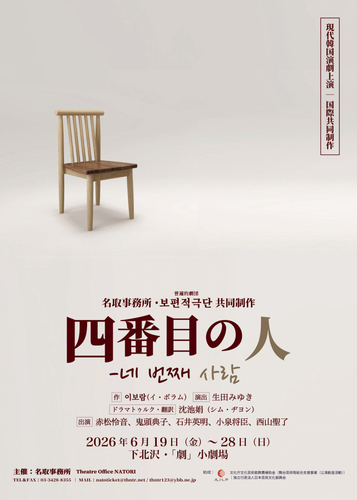 名取事務所主催、名取事務所・普遍的劇団 共同制作『四番目の人』が2026年6月19日 (金) 〜 6月28日 (日)に下北沢「劇」小劇場 (東京都世田谷区北沢 2-6-6)にて上演されます。 チケットはカンフェティ(運営:ロングランプランニング株式会社、東京都新宿区、代表取締役:榑松 大剛)にて発売中です。