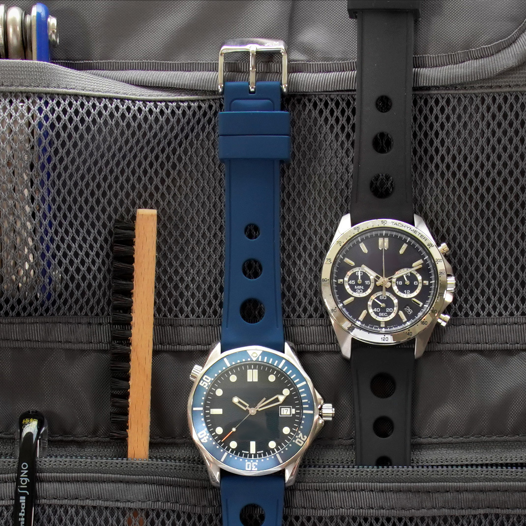 大きな穴のデザインが印象的なシリコンベルト。最大厚5.5mmと厚みがあり、シリコン素材でありながらどっしりとした高級感が特徴です。裏面の溝の加工と中央に大きくあいた穴によって、通気性が確保され、着け心地も快適。厚みのある甲丸と、サイドの溝によってシャープな見た目のデザインも魅力的なスポーティーな一本です。