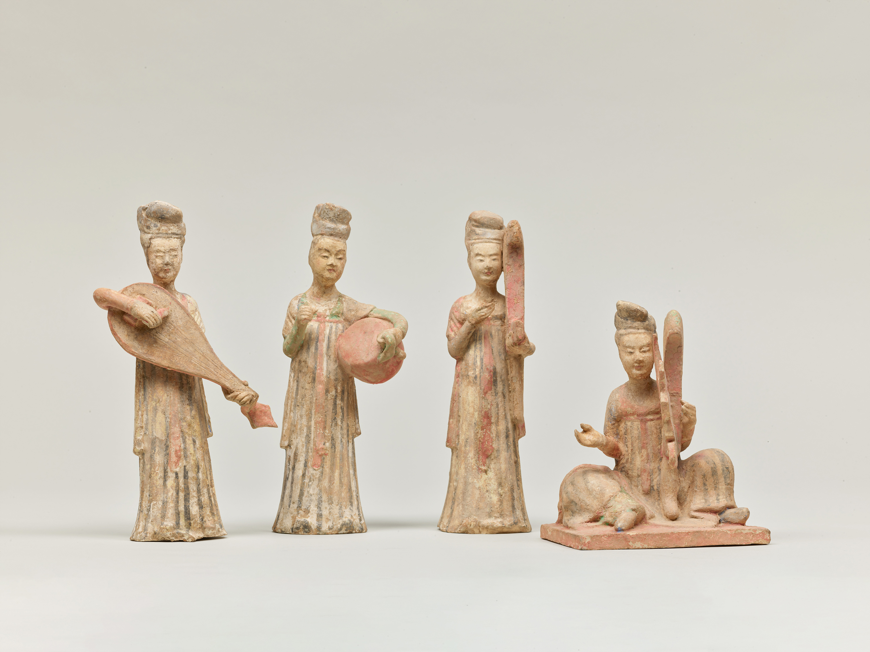 竪琴や琵琶、太鼓を持って演奏する女性たちを表したやきものの人形です。唐時代、死後の世界を豊かに過ごすため、人や動物、生活道具などをかたどったやきものが墓に納められました。
