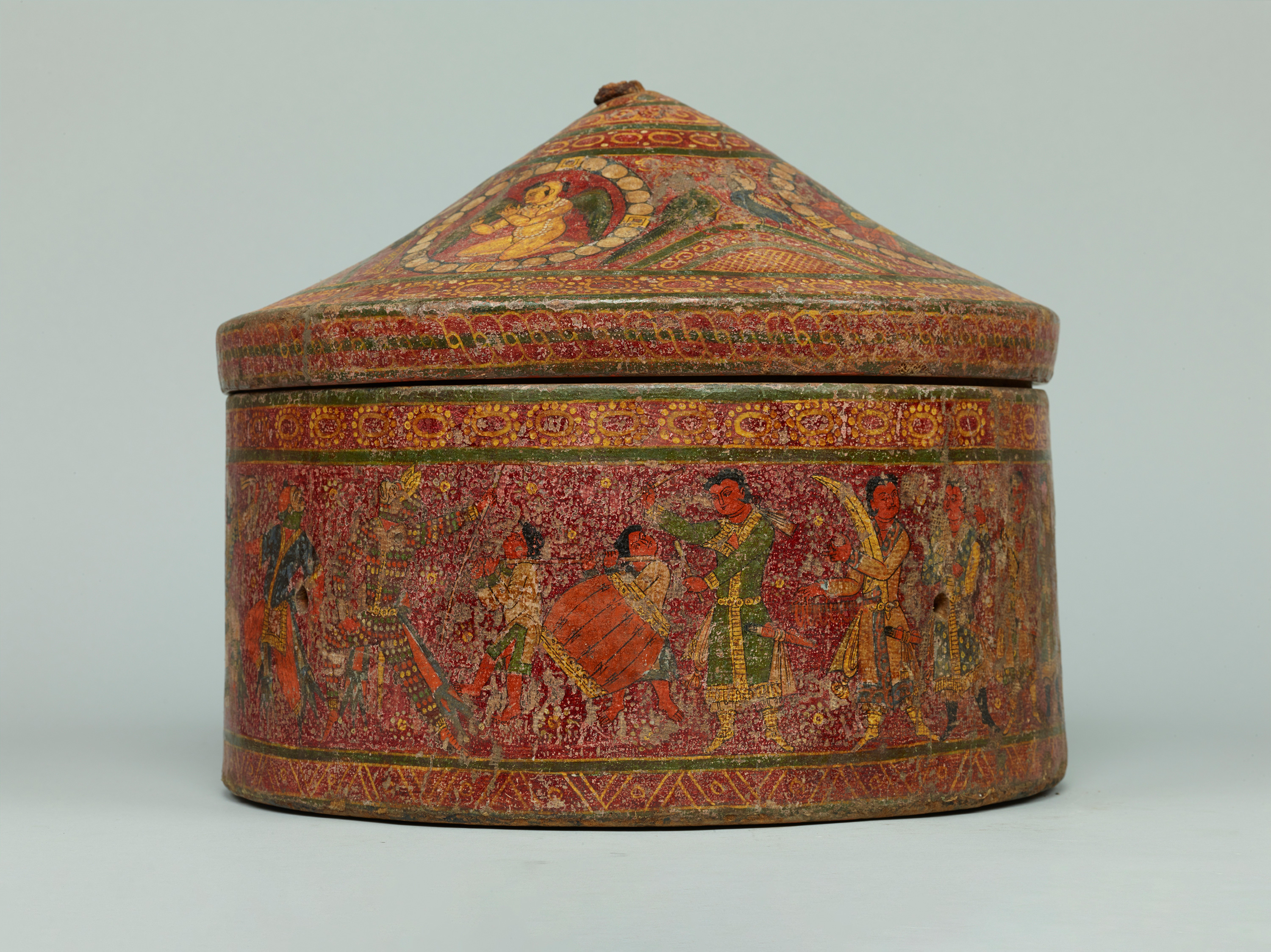 蓋には楽器を演奏する天人、身の側面には仮面舞踏や楽団が描かれており、いずれも当時のクチャ地方の芸能文化を知る手掛かりとなっています。