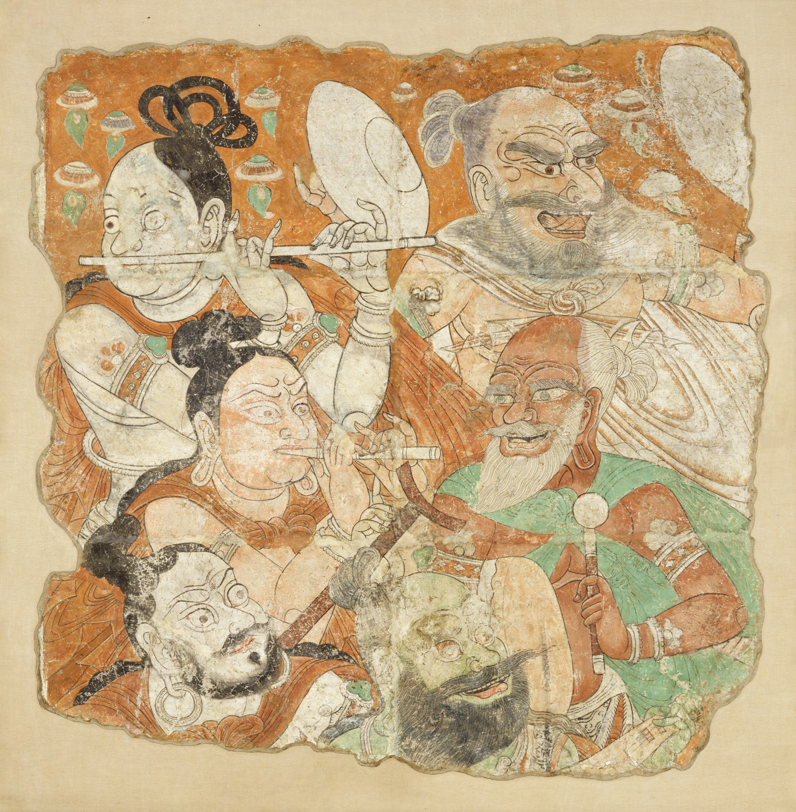 ベゼクリク石窟は、『西遊記』でおなじみの火焔山(かえんざん)の麓につくられた石窟寺院で、そこには10世紀にこの地に移り住んだウイグル人独自の仏教美術がみられます。くっきりとした目鼻立ちの人物は、横笛、縦笛、シンバル、太鼓、四絃琵琶などを演奏しています。スピード感あふれる、にぎやかな音楽が聞こえてくるようです。