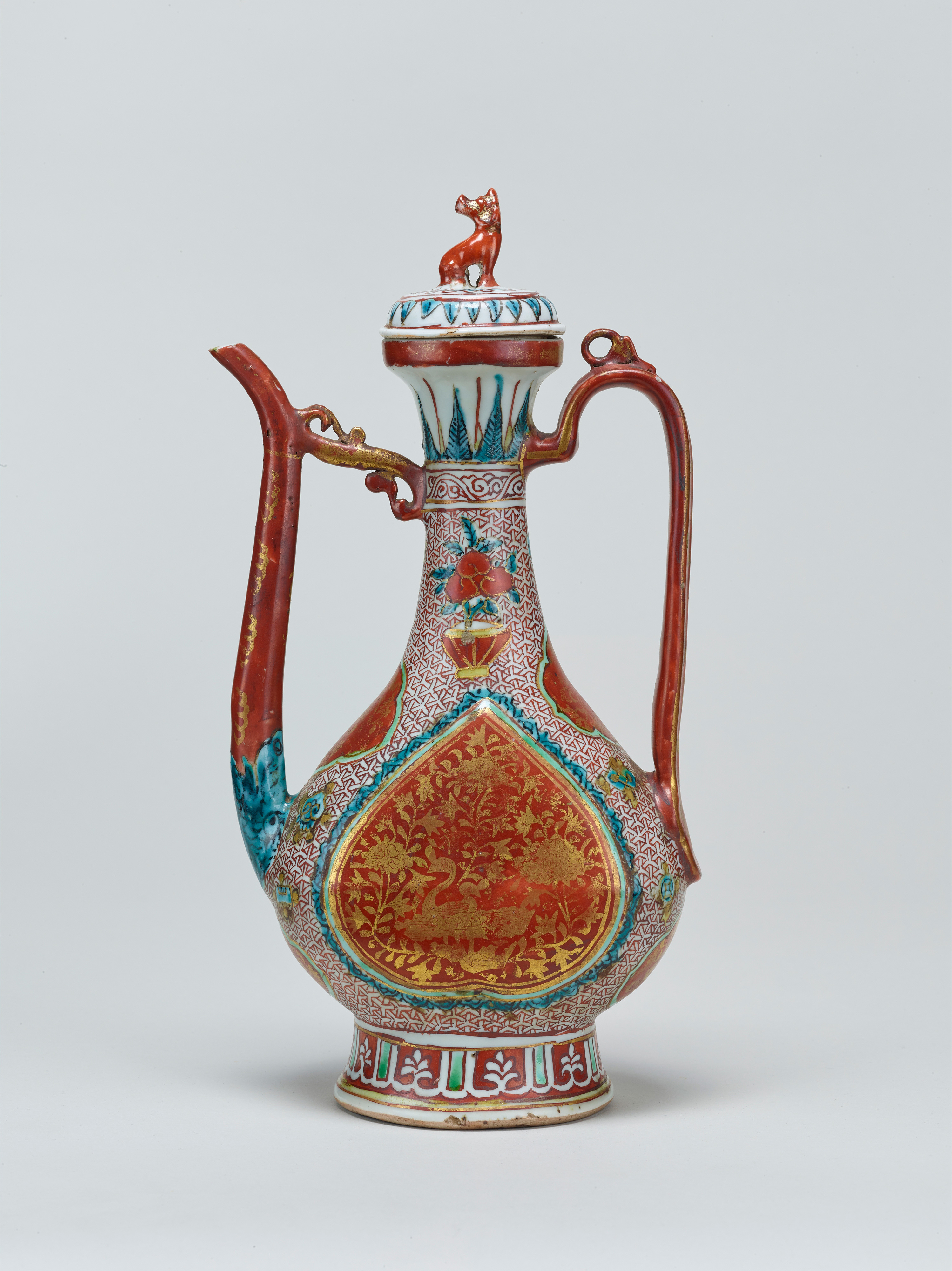 お酒を入れるのに使われる「仙盞瓶(せんさんぴん)」とよばれるこの水注は、イスラームの金属器の影響を受けた形と考えられています。華やかな金彩による絵付けは高価な金襴にたとえられ、16~17世紀の日本でも戦国大名や豪商に珍重されました。