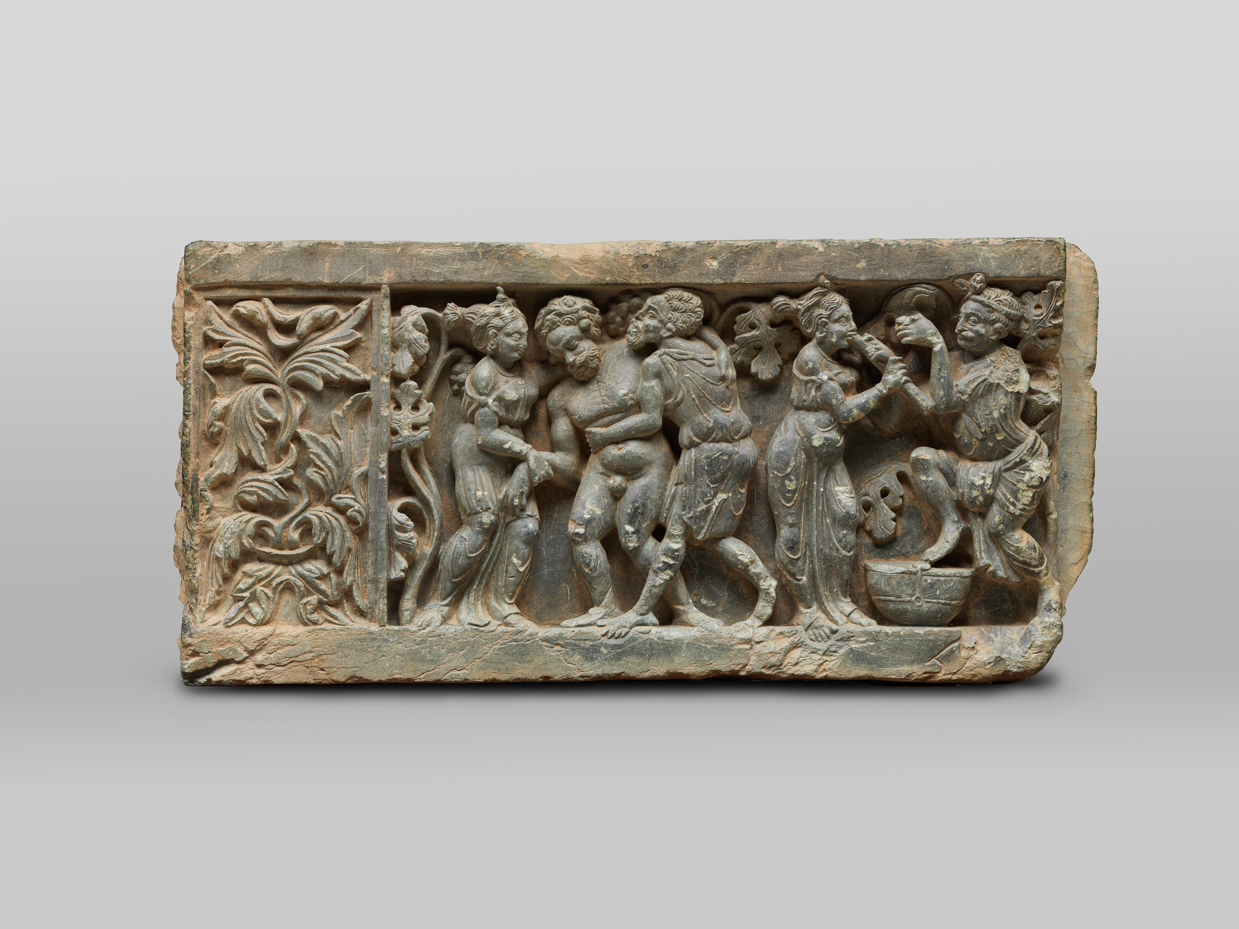 ガンダーラの仏教寺院には、一見、仏教に関連しているとは思えない享楽的な情景を表現した彫刻がみられます。